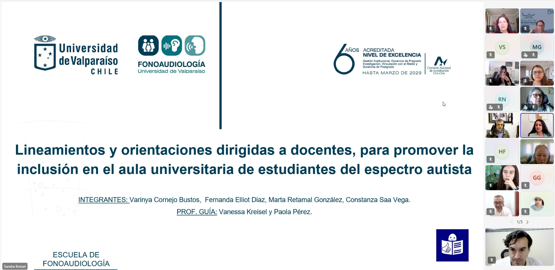 Las presentaciones estuvieron a cargo de Vanessa Kreisel (Escuela de Fonoaudiología), quien expuso orientaciones para favorecer la inclusión de estudiantes neurodivergentes; Paul Betancourt, Lorena Durán, Iván Echeverría y Pilar Valle (Escuela de Psicología), quienes compartieron la experiencia del taller de desarrollo personal como espacio formativo y de reflexión pedagógica; y Estefanía Cruz (Escuela de Obstetricia y Puericultura, Campus San Felipe), quien presentó un enfoque pedagógico basado en IA para fortalecer competencias de comunicación oral y escrita.